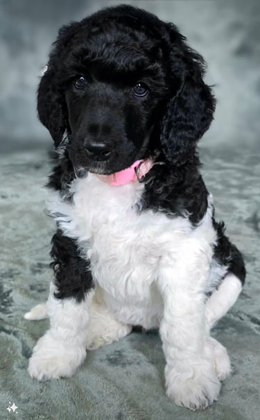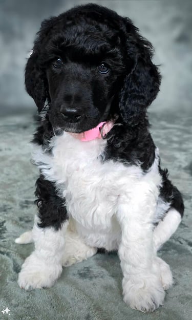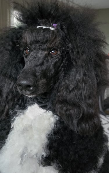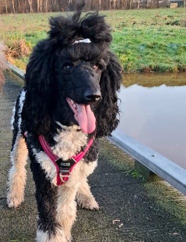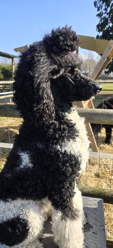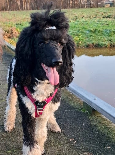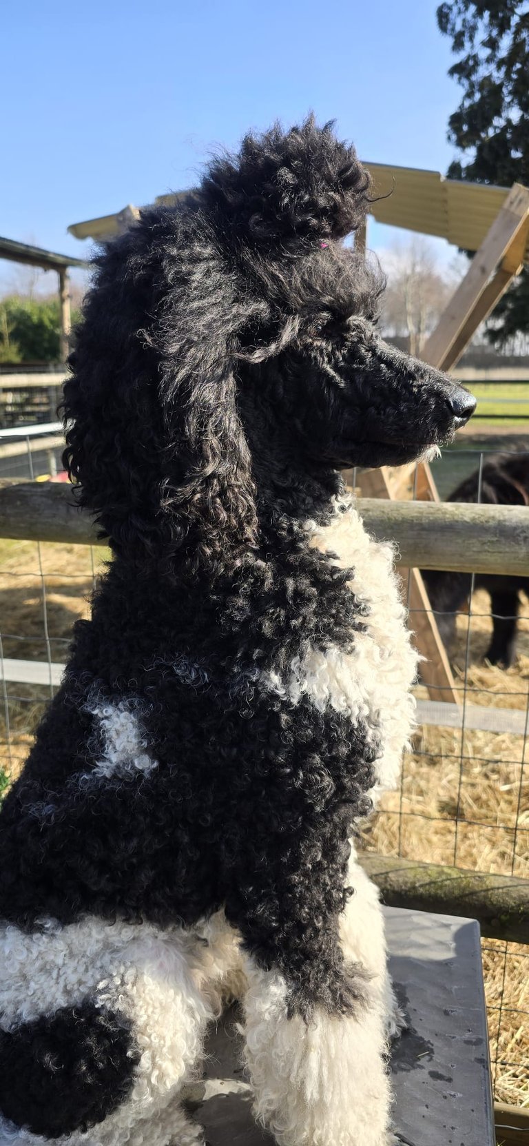Magic is een erg lief en knap Harlekijn Standaard Poedel teefje van nu 2 jaar en 50cm 16kg, rustig en vriendelijk naar mensen, maar is wat onzeker en vind andere honden buiten haar roedel wel heel erg spannend dus hiermee moet verder flink getraind worden. Wij zoeken dan ook iemand die veel thuis is. Iemand met heel veel geduld en veel met haar kan oefenen, maar wel haar karakter accepteert zoals ze nu is, ook als het niet meer lukt om los te lopen tussen andere honden (wij denken zelf met veel trainen dat dit wel goed komt). Hier komen wij bijna nooit andere honden tegen dus nemen we haar regelmatig mee naar de bouwmarkt en tuincentra en dat gaat al heel goed vooral met hondjes die kleiner zijn of Poedels. Autorijden vind ze ook helemaal prima. Het is verder een ontzettend rustig en lief knuffelbeer/schoothondje, ze is gezond en heel braaf met wassen/blazen en trimmen. Voor meer info of een kennismaking stuur gerust een mailtje.